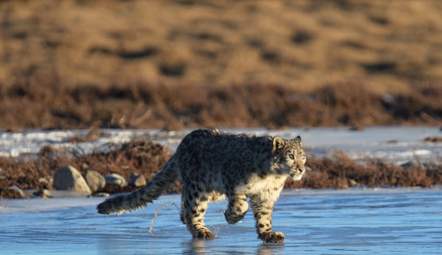 In the footage, the snow leopard is seen crawling through the grass and strolling around. Upon reaching the frozen lake, it cautiously approaches it, displaying an endearing demeanor. After crossing the lake, the leopard runs toward the grassland and eventually disappears from view.