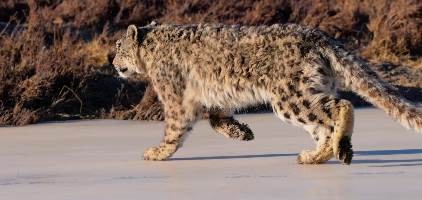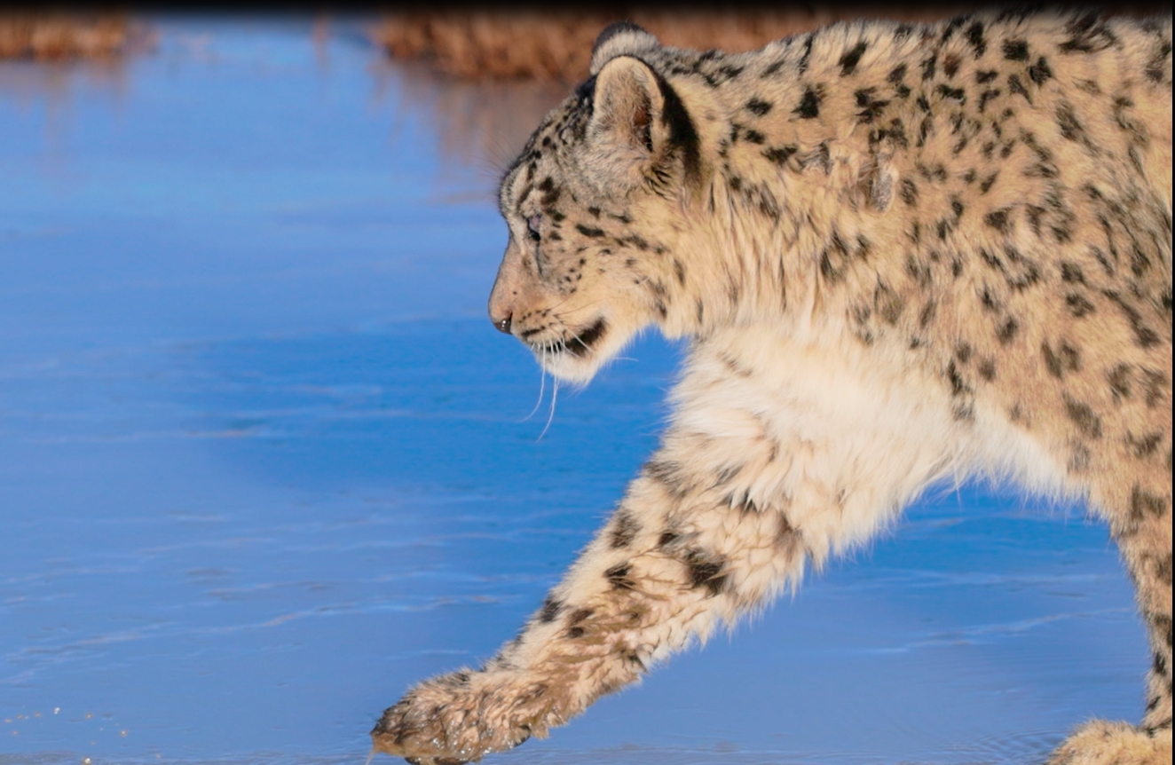 The rare sight of a snow leopard crossing a frozen lake was recently captured in Qilian Mountain National Park in Qilian county, northwest China's Qinghai Province. This marks the first time the area has recorded such valuable footage of a snow leopard's activities.