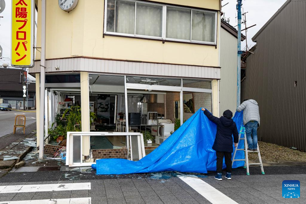 Residents attempt to screen earthquake-damaged windows with fabric in Nanao, Ishikawa prefecture, Japan on Jan. 3, 2024. (Xinhua/Zhang Xiaoyu)