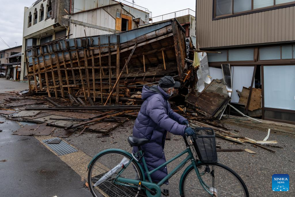 A man passes by earthquake-damaged houses in Nanao, Ishikawa prefecture, Japan, Jan. 3, 2024. (Xinhua/Zhang Xiaoyu)