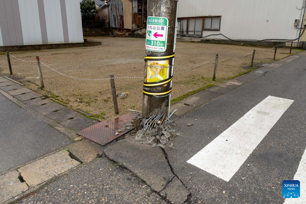 This photo taken on Jan. 3, 2024 shows an earthquake-damaged wire pole in Nanao, Ishikawa prefecture, Japan. (Xinhua/Zhang Xiaoyu)