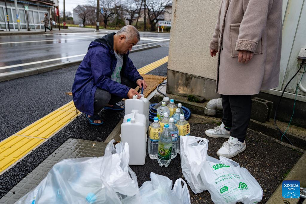 Residents fetch fresh water at an aquatic products store in Nanao, Ishikawa prefecture, Japan, Jan. 3, 2024. (Xinhua/Zhang Xiaoyu)