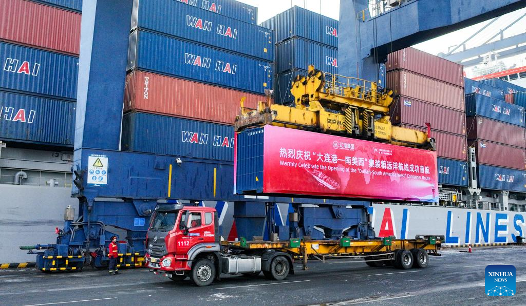 DALIAN, Jan. 3 (Xinhua) -- A container ship, named "WAN HAI 357," arrived at the Dalian port in northeast China's Liaoning Province on Tuesday, marking a regular container ship route linking the port and the west coast of South America has been launched.