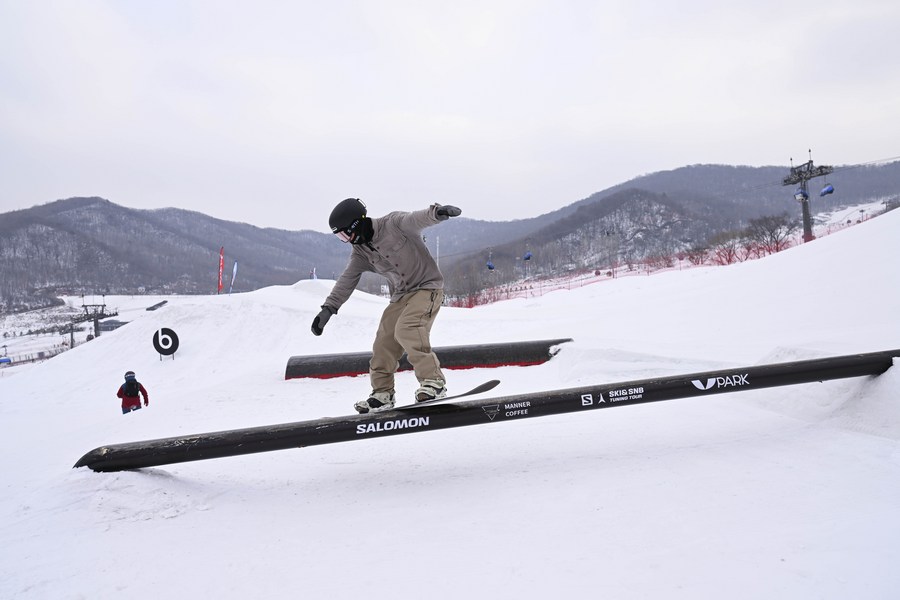 A skier enjoys skiing at V-PARK in Jilin City, northeast China's Jilin Province on Feb. 11, 2023. (Xinhua/Tao Xiyi)