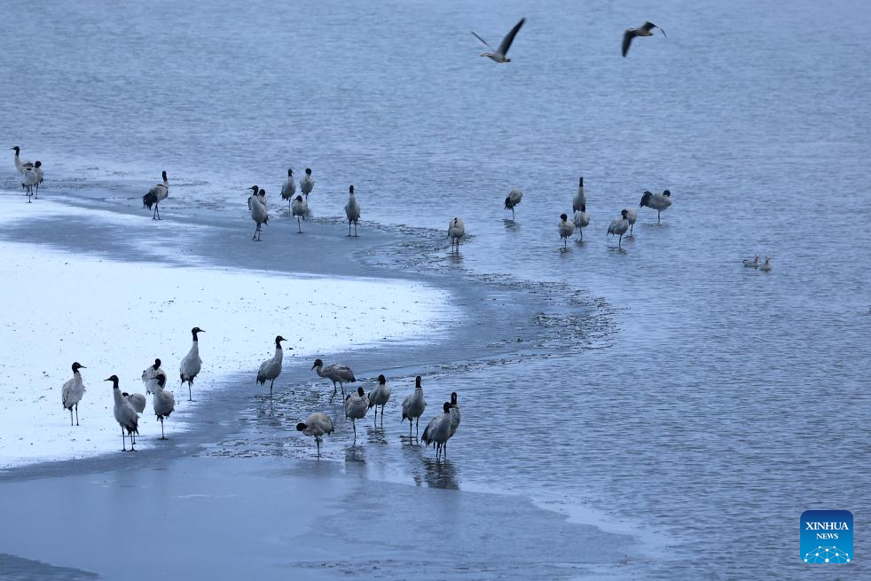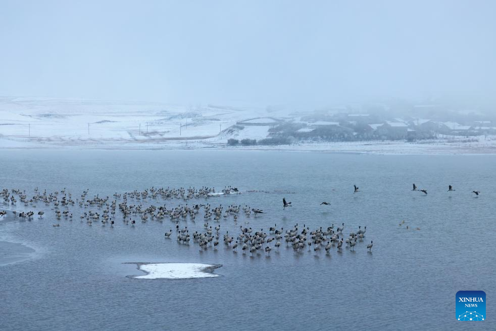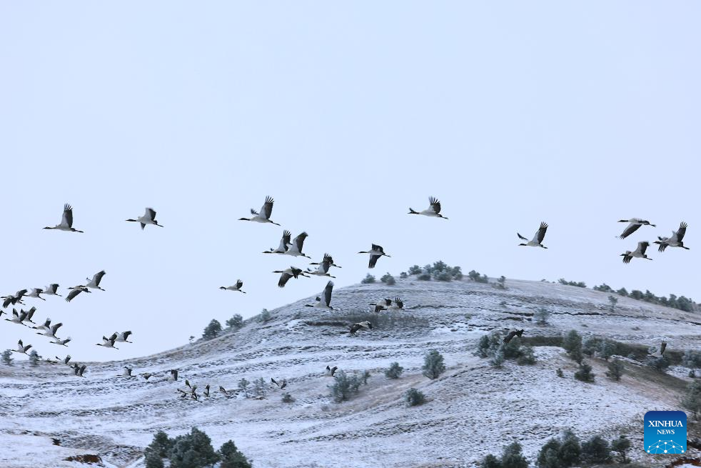 This photo taken on Jan. 3, 2024 shows black-necked cranes at the Yunnan Dashanbao national nature reserve, southwest China's Yunnan Province. The nature reserve witnessed its first snow of this new year on Wednesday. (Photo by Wu Taiping/Xinhua)