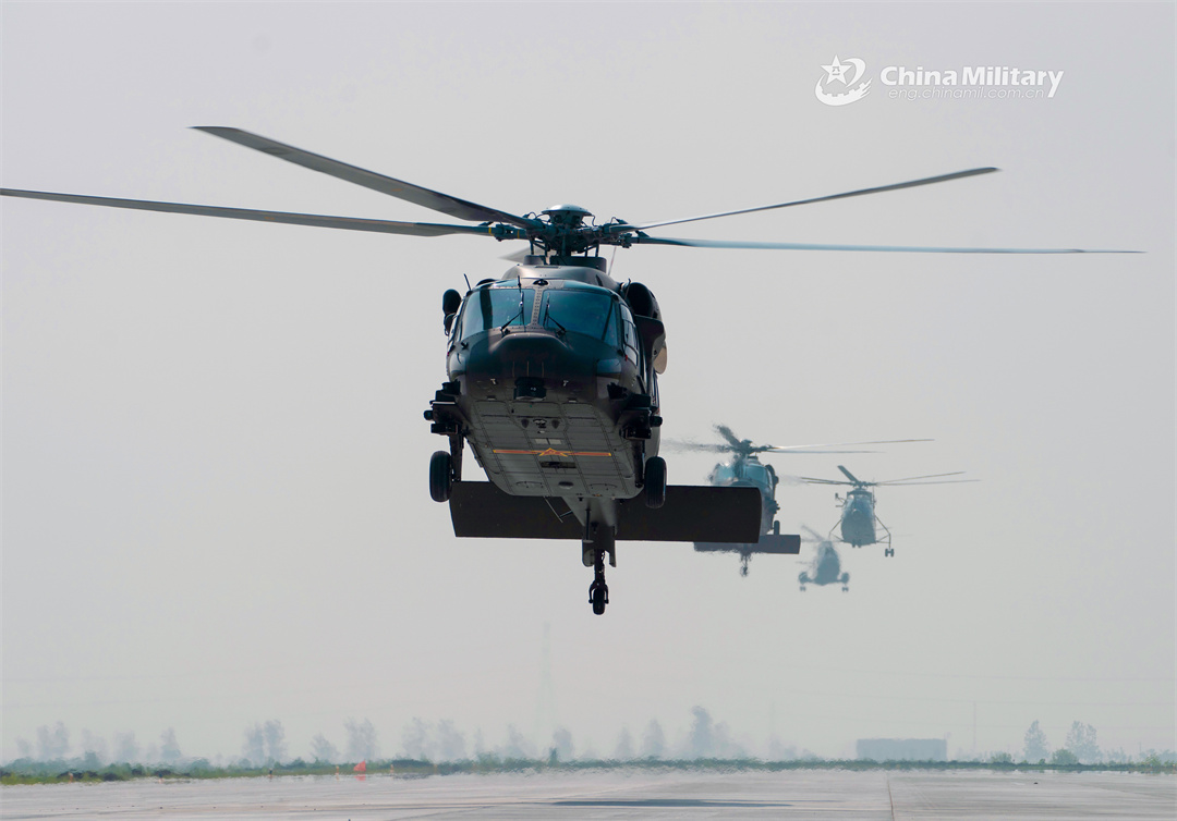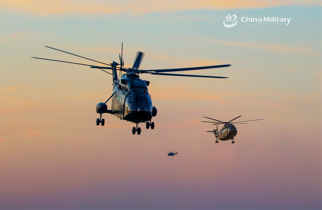Helicopters attached to an aviation brigade under the PLA 71st Group Army lift off in formation for round-the-clock flight training in late December, 2023. (eng.chinamil.com.cn/Photo by Li Jingyou)