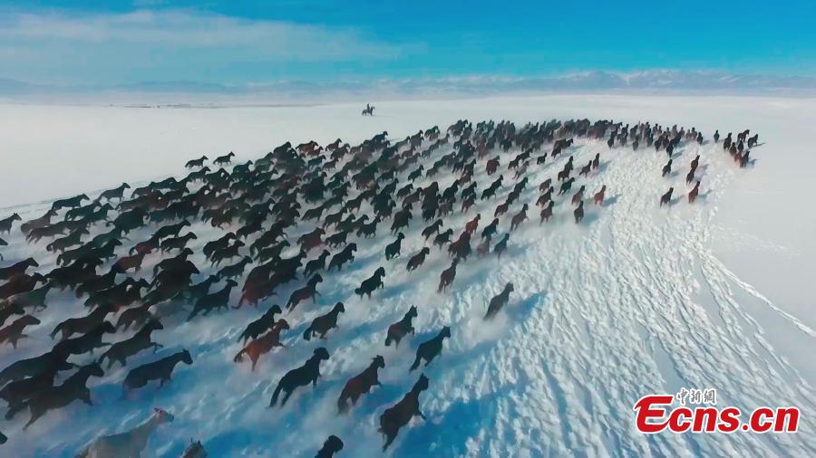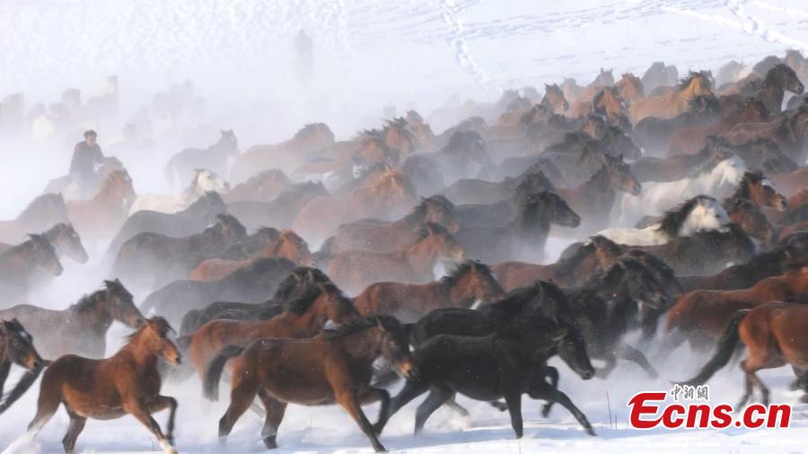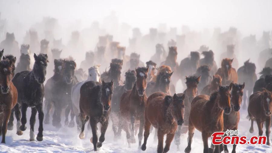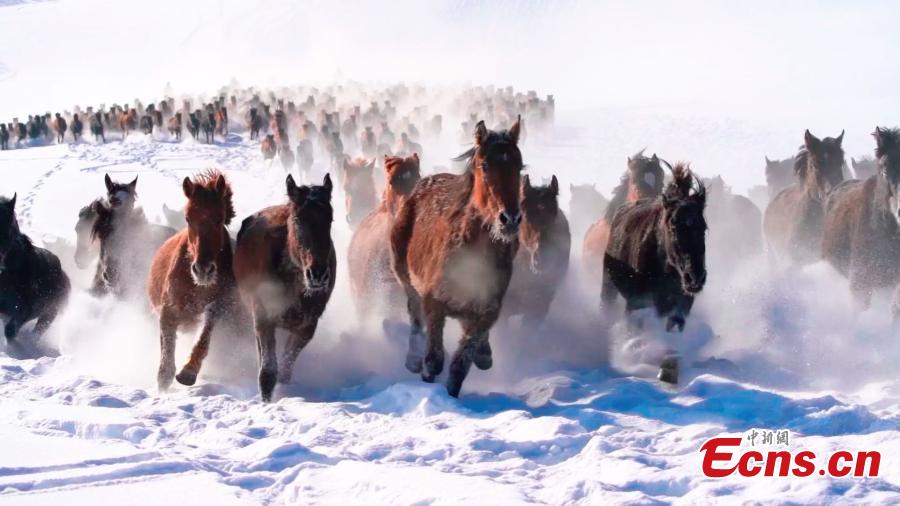 Horse galloping in snow creates fascinating attraction in Xinjiang