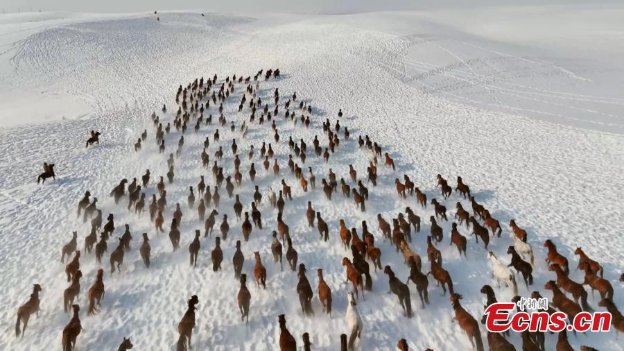 Horses gallop on a snow-covered grassland in Zhaosu county, Ili Kazak Autonomous Prefecture, northwest China's Xinjiang Uygur Autonomous Region, Jan. 3, 2024. The performance produces fascinating attraction in Xinjiang. (Photo/China News Service)