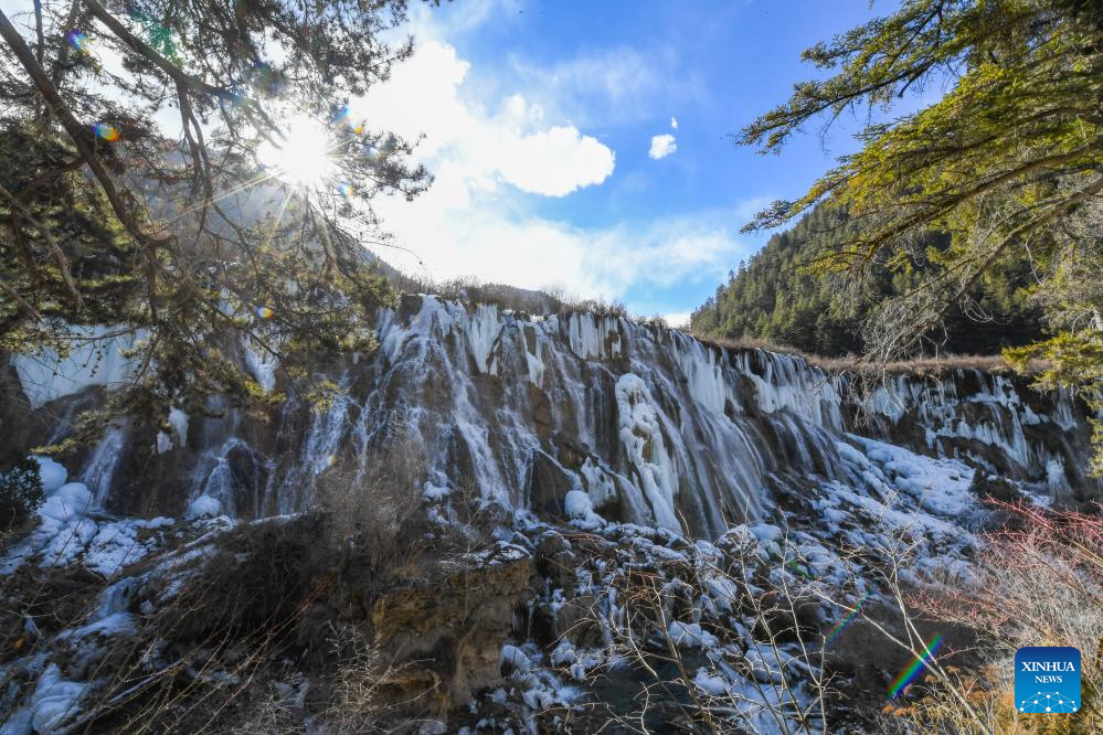 This photo taken on Jan. 4, 2024 shows the frozen Nuorilang Waterfall at the Jiuzhaigou National Park in southwest China's Sichuan Province. (Xinhua/Wang Xi)