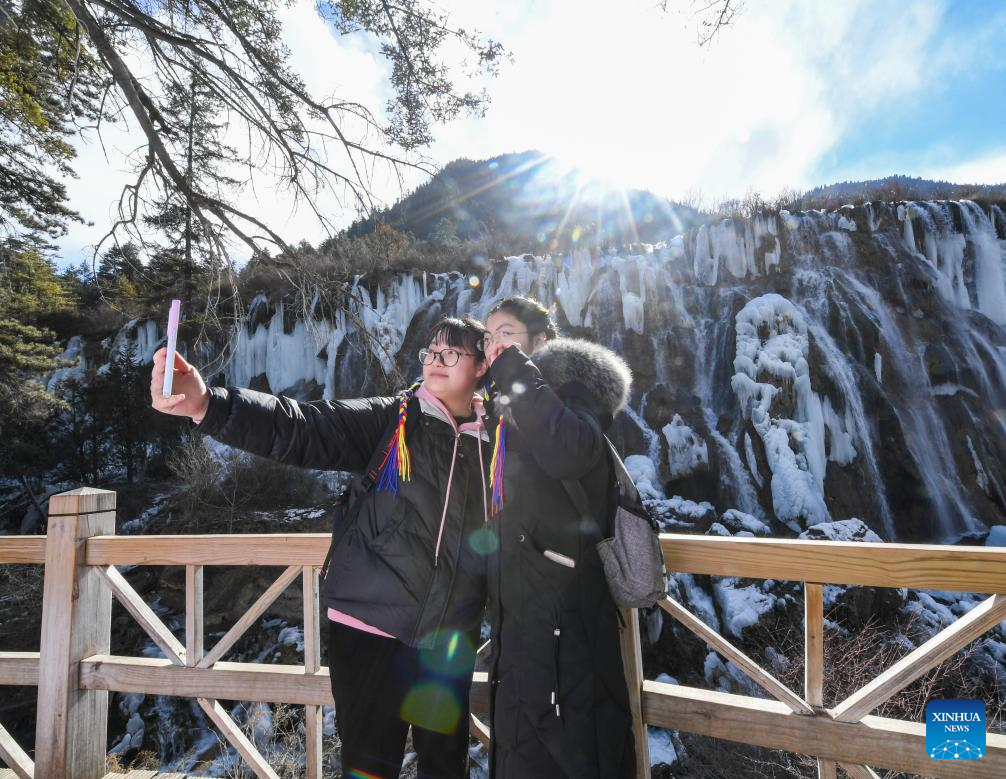 Tourists take photos in front of a frozen waterfall at the Jiuzhaigou National Park in southwest China's Sichuan Province, Jan. 4, 2024. (Xinhua/Wang Xi)?