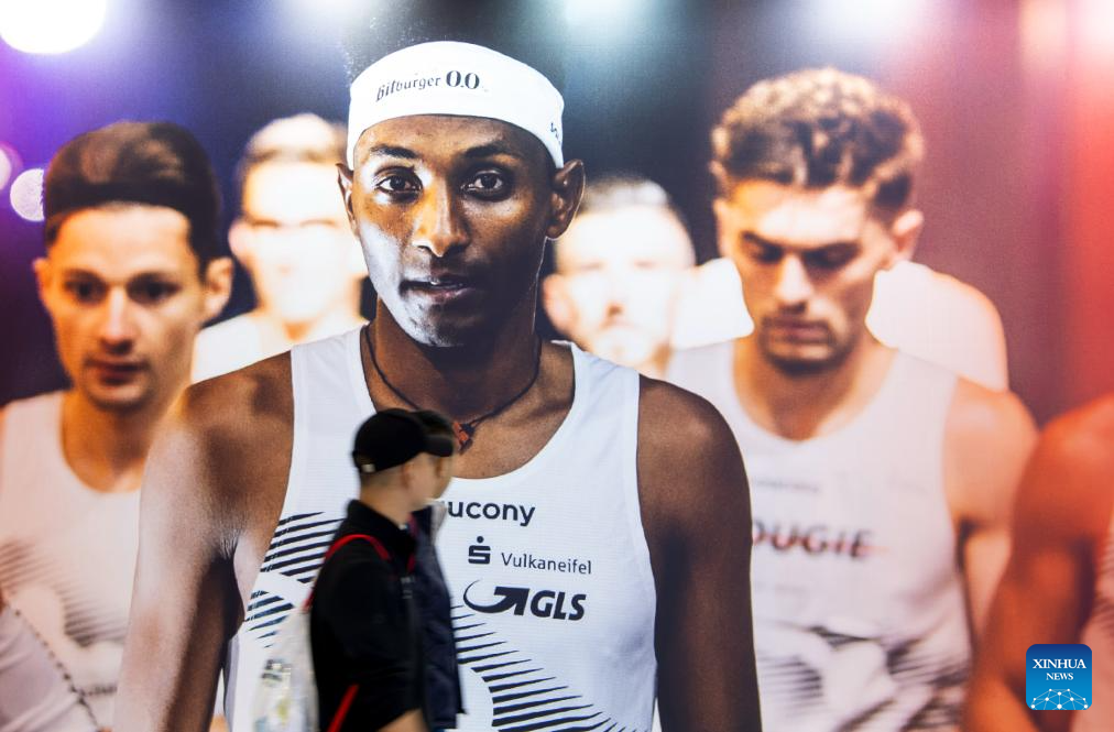 IAAF road running manager Alessio Punzi (L) and Bob Ramsak, head of sustainability at World Athletics, visit the 5th China Marathon Expo in Xiamen, southeast China's Fujian Province, Jan. 4, 2024. (Xinhua/Wei Peiquan)