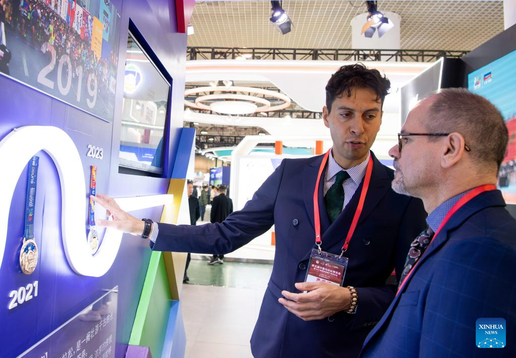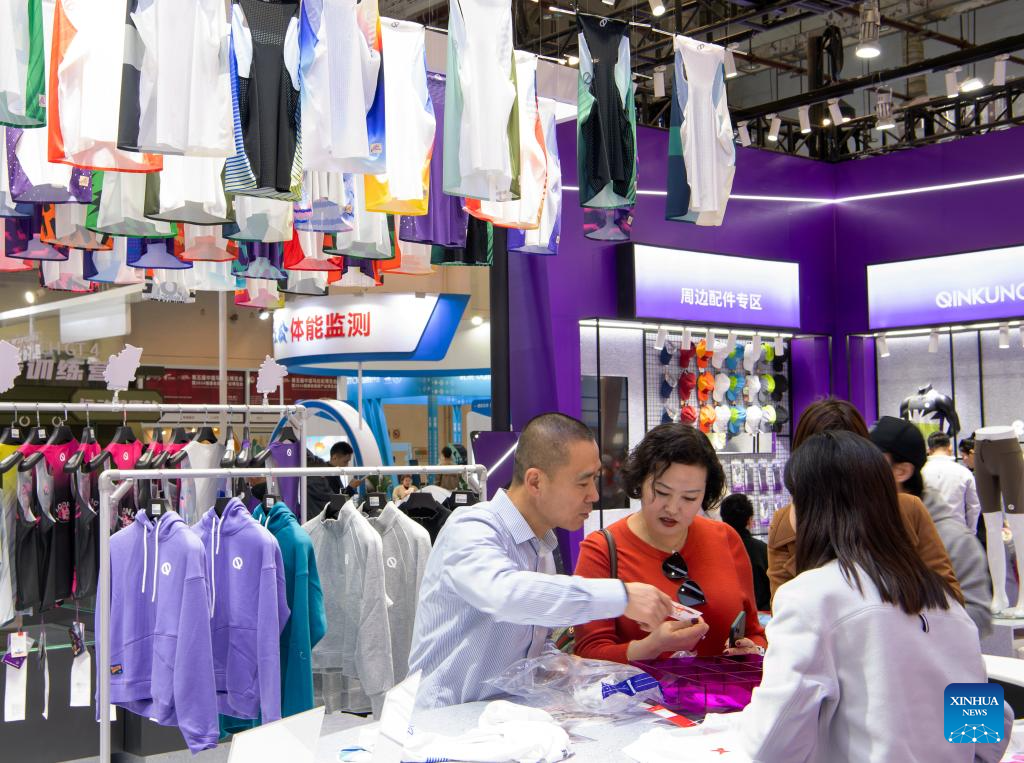 Visitors view sports wear at the 5th China Marathon Expo in Xiamen, southeast China's Fujian Province, Jan. 4, 2024. (Xinhua/Wei Peiquan)