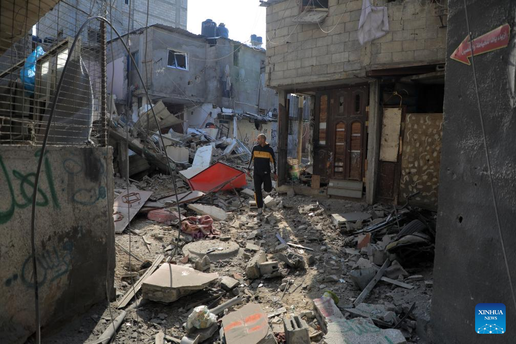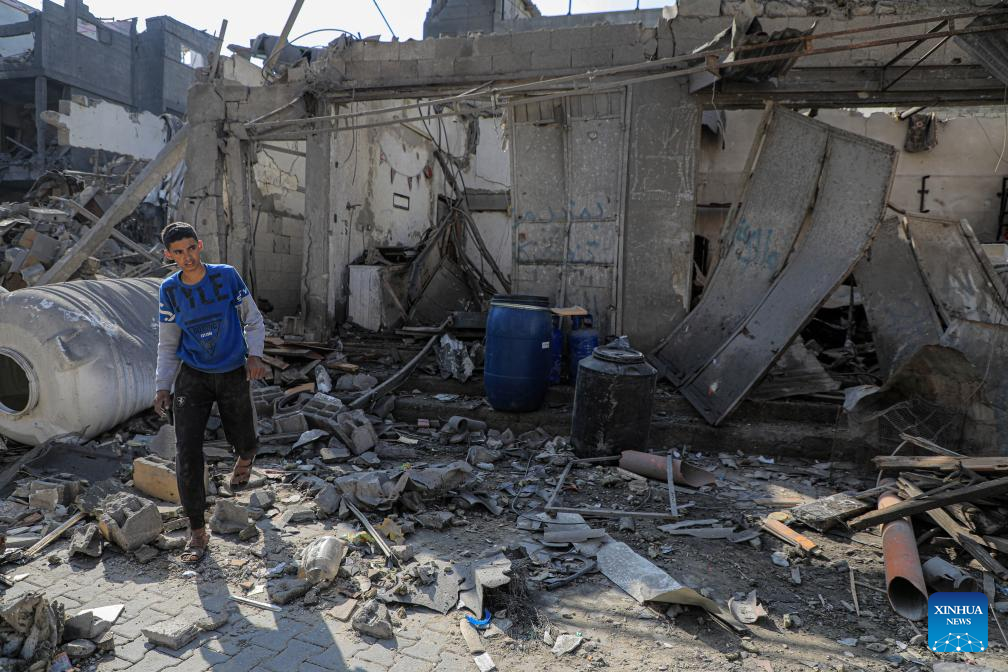 People walk among the rubble of buildings destroyed in Israeli strikes in the southern Gaza Strip city of Khan Younis, on Jan. 4, 2024. Palestinian death toll from Israeli strikes on the Gaza Strip rose to 22,438 since the Israel-Hamas conflict broke out on Oct. 7, 2023, said the Gaza-based Health Ministry on Thursday. (Photo by Rizek Abdeljawad/Xinhua)