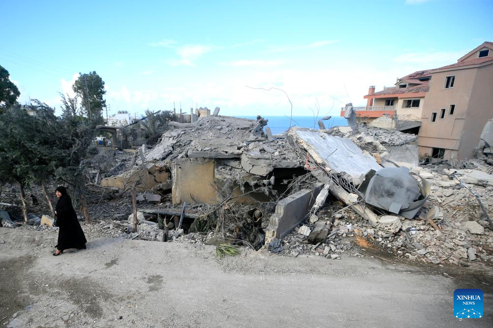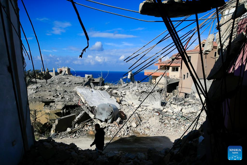 A man walks past buildings destroyed in an Israeli airstrike in Naqoura, Lebanon, on Jan. 4, 2024. Israeli Defense Minister Yoav Gallant said on Thursday the window of time for a diplomatic solution with Hezbollah is short. (Photo by Ali Hashisho/Xinhua)