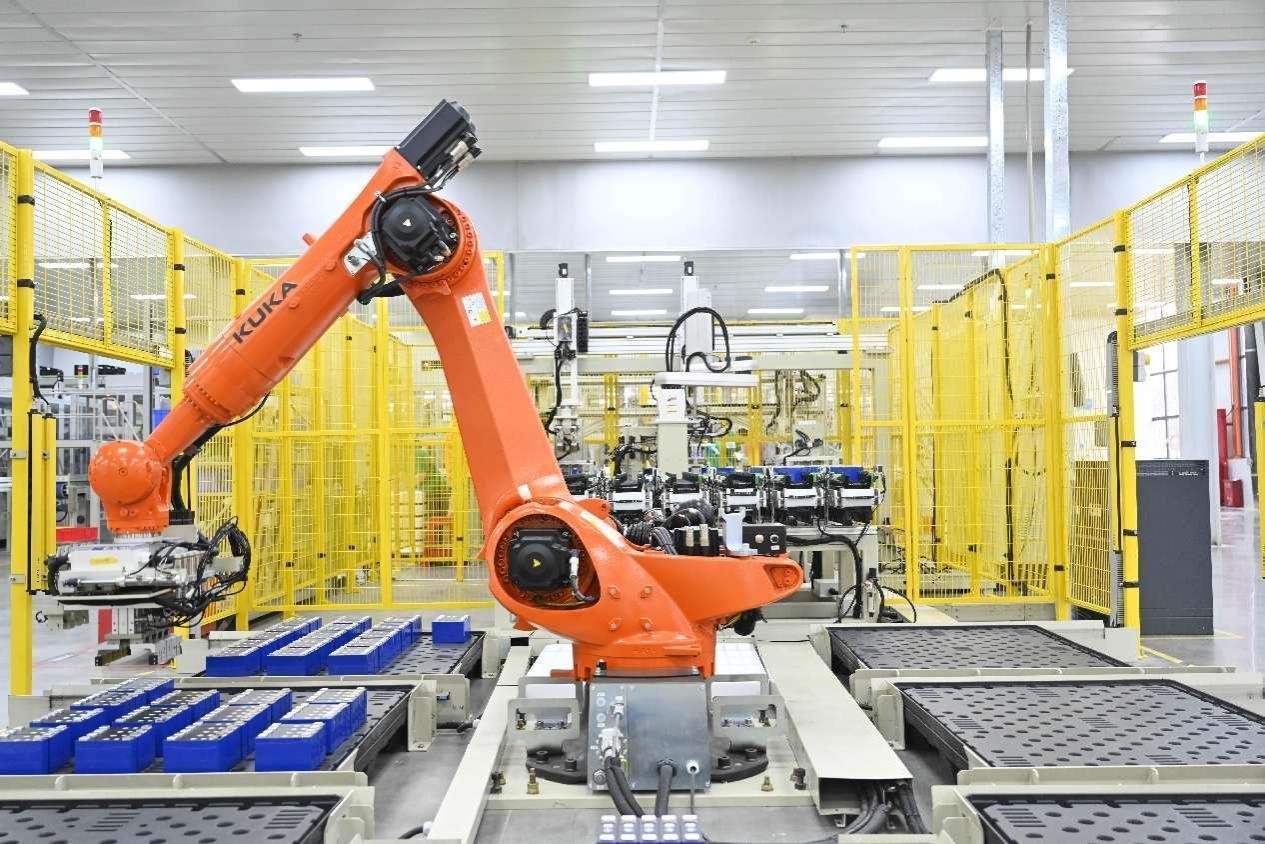 A robotic arm manufactures energy storage batteries in a workshop of a company in Liuzhou, south China's Guangxi Zhuang autonomous region. (People's Daily Online/Li Hanchi)