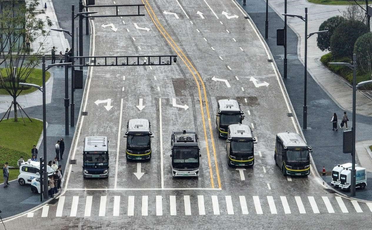 Autonomous driving buses run on a road in southwest China's Chongqing municipality. (People's Daily Online/Long Fan)