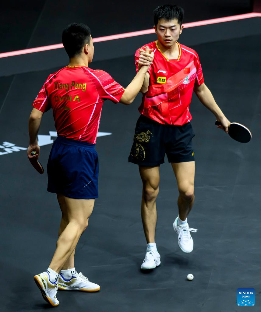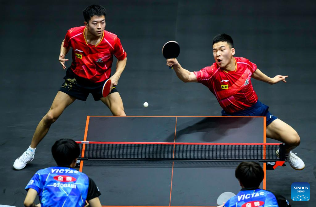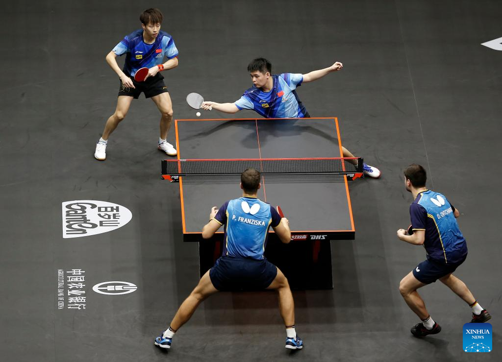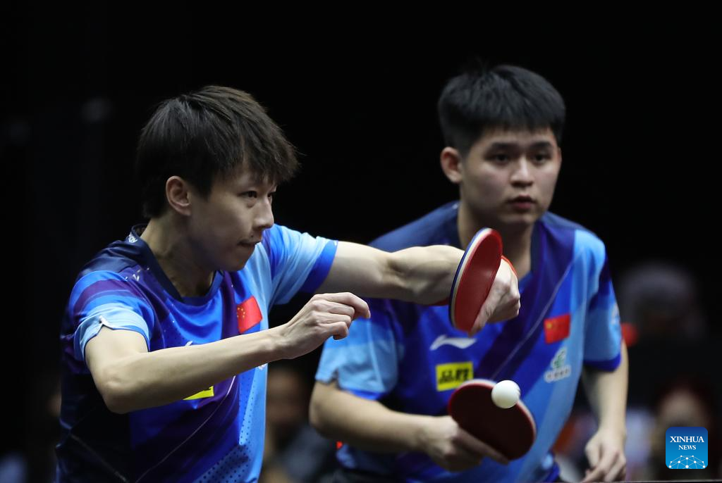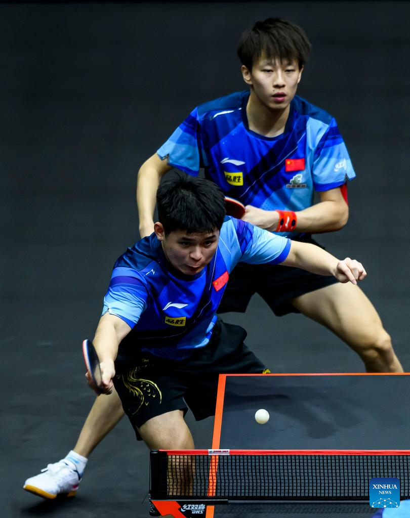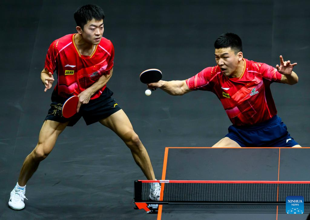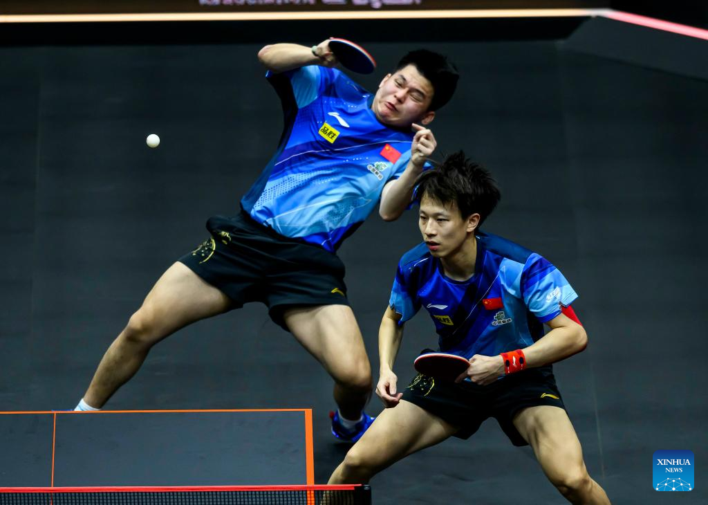 Lin Gaoyuan (L)/Lin Shidong of China compete during the men's doubles quarterfinal between Lin Gaoyuan/Lin Shidong of China and Dimitrij Ovtcharov/Patrick Franziska of Germany at WTT Finals Men Doha 2023 table tennis tournament in Doha, Qatar, Jan. 4, 2024. (Xinhua/Wang Dongzhen)