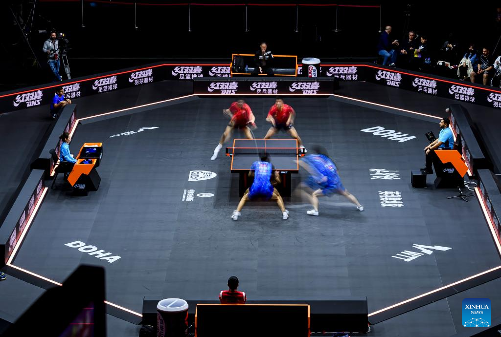 Lin Gaoyuan (R)/Lin Shidong of China compete during the men's doubles quarterfinal between Lin Gaoyuan/Lin Shidong of China and Dimitrij Ovtcharov/Patrick Franziska of Germany at WTT Finals Men Doha 2023 table tennis tournament in Doha, Qatar, Jan. 4, 2024. (Xinhua/Wang Dongzhen)