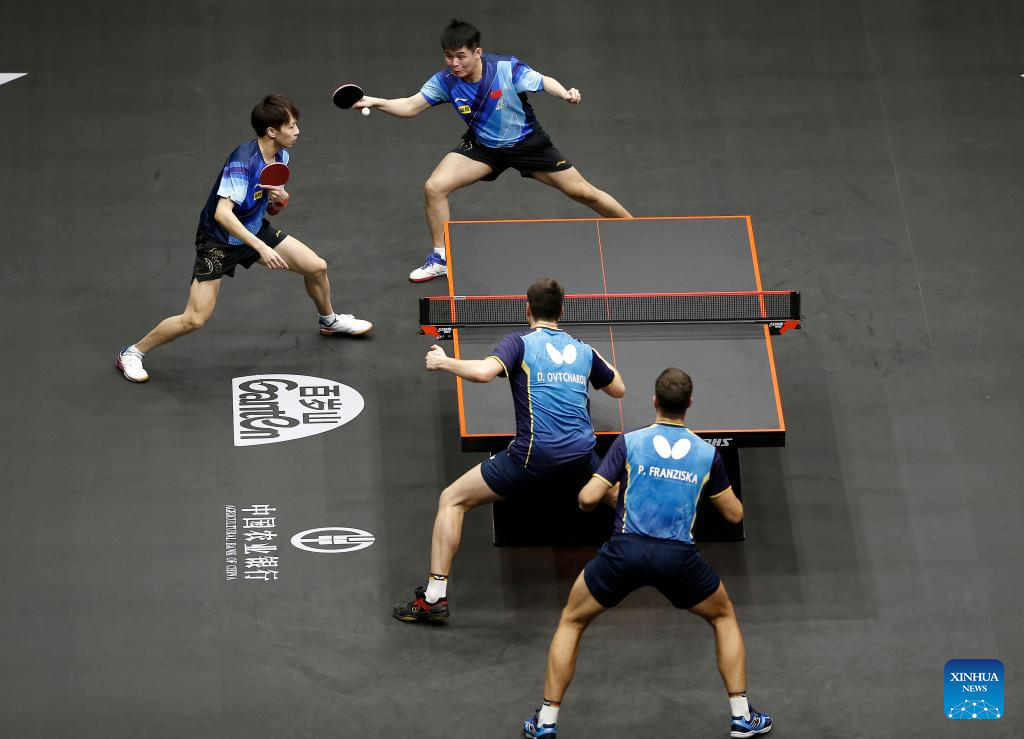 Dimitrij Ovtcharov (front)/Patrick Franziska of Germany compete during the men's doubles quarterfinal between Lin Gaoyuan/Lin Shidong of China and Dimitrij Ovtcharov/Patrick Franziska of Germany at WTT Finals Men Doha 2023 table tennis tournament in Doha, Qatar, Jan. 4, 2024. (Xinhua/Wang Dongzhen)