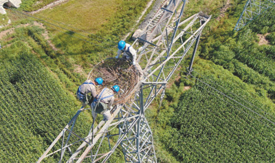 Staff members of the State Grid Corporation of China build an artificial bird nest in a safe area atop a power transmission tower. (Photo courtesy of the State Grid)