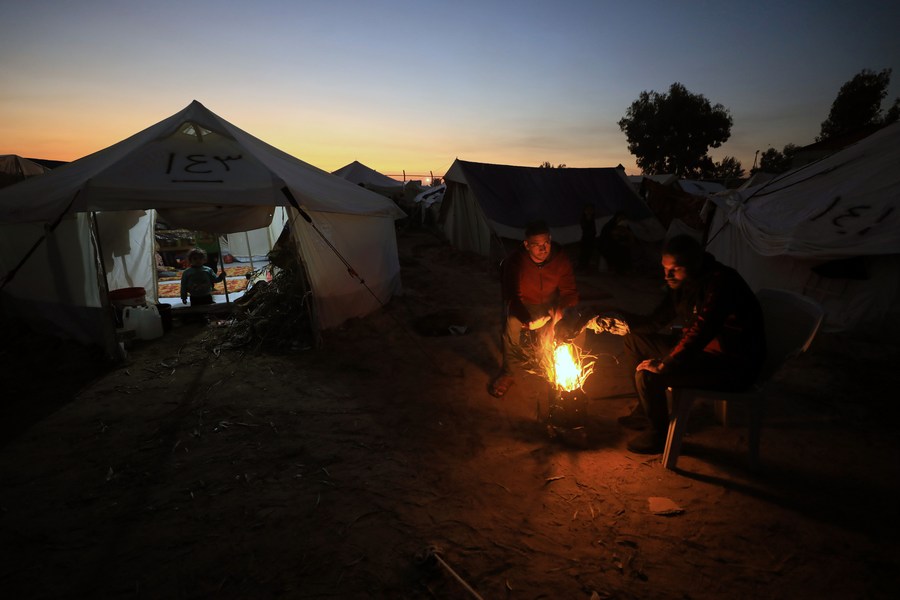 Displaced Palestinians keep warm by a fire at a temporary shelter in the southern Gaza Strip city of Rafah, on Dec. 18, 2023. (Photo by Yasser Qudih/Xinhua)