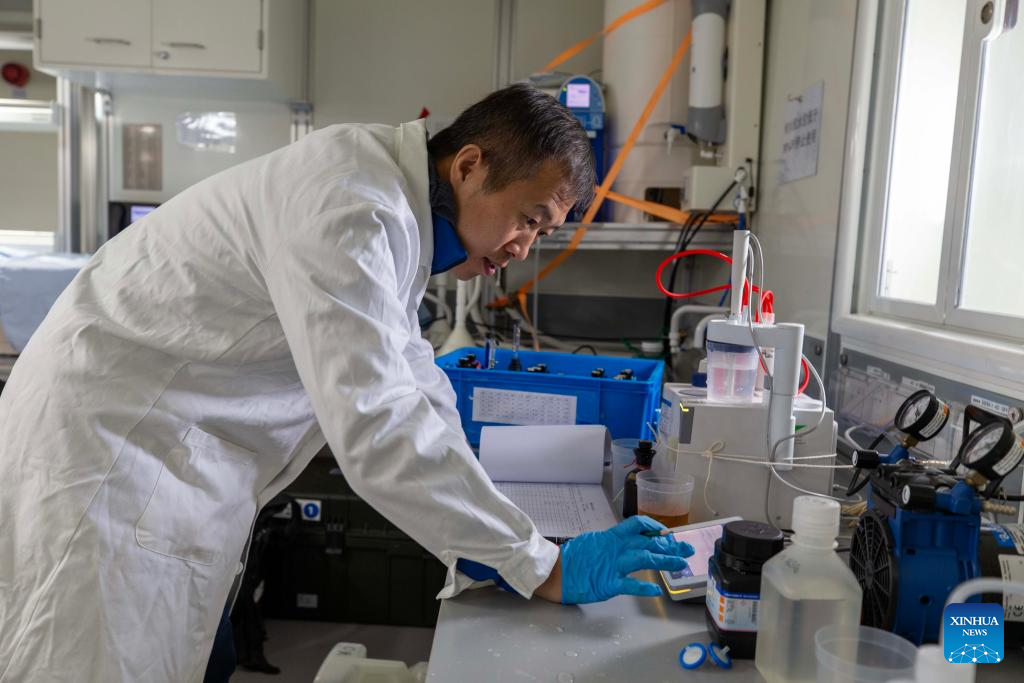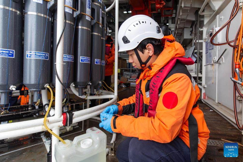 A member of China's 40th Antarctic expedition deals with collected samples of seawater aboard China's research icebreaker Xuelong 2 in the Amundsen Sea, Jan. 7, 2024. Members of China's 40th Antarctic expedition team have recently conducted scientific work aboard China's research icebreaker Xuelong 2 in the Amundsen Sea. (Xinhua/Zhou Yuan)