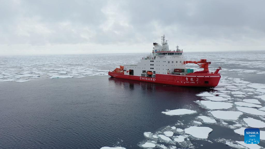 This aerial photo taken on Jan. 6, 2024 shows China's research icebreaker Xuelong 2 conducting scientific expedition in the Amundsen Sea. Members of China's 40th Antarctic expedition team have recently conducted scientific work aboard China's research icebreaker Xuelong 2 in the Amundsen Sea. (Photo by Chen Dongbin/Xinhua)