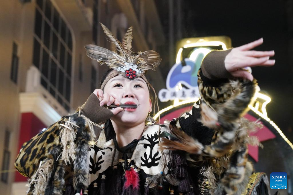 A Hezhe woman wearing traditional costumes plays a musical instrument in Harbin, northeast China's Heilongjiang Province, Jan. 6, 2024. (Xinhua/Wang Jianwei)