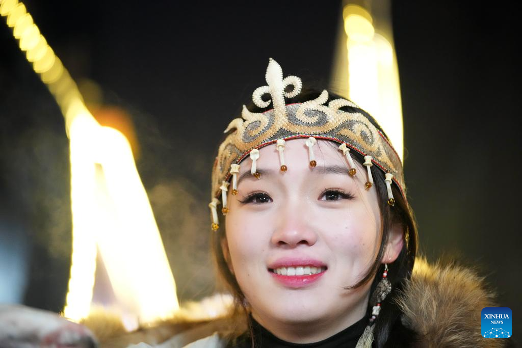 A Hezhe woman wearing traditional costumes dances in Harbin, northeast China's Heilongjiang Province, Jan. 6, 2024. (Xinhua/Wang Jianwei)