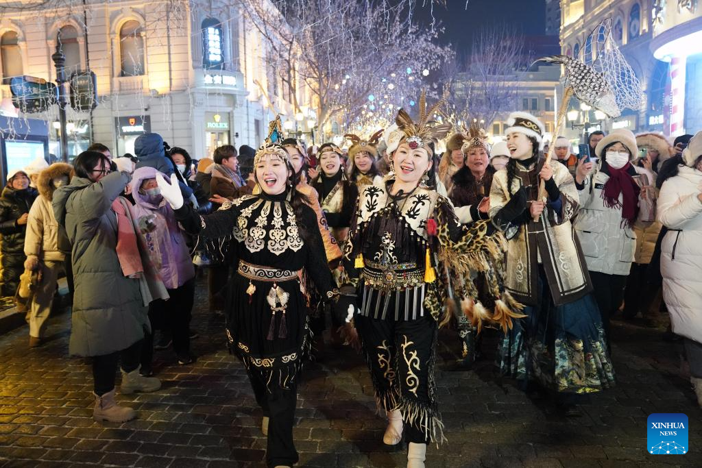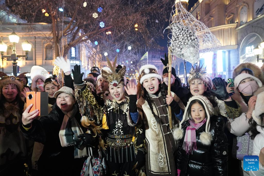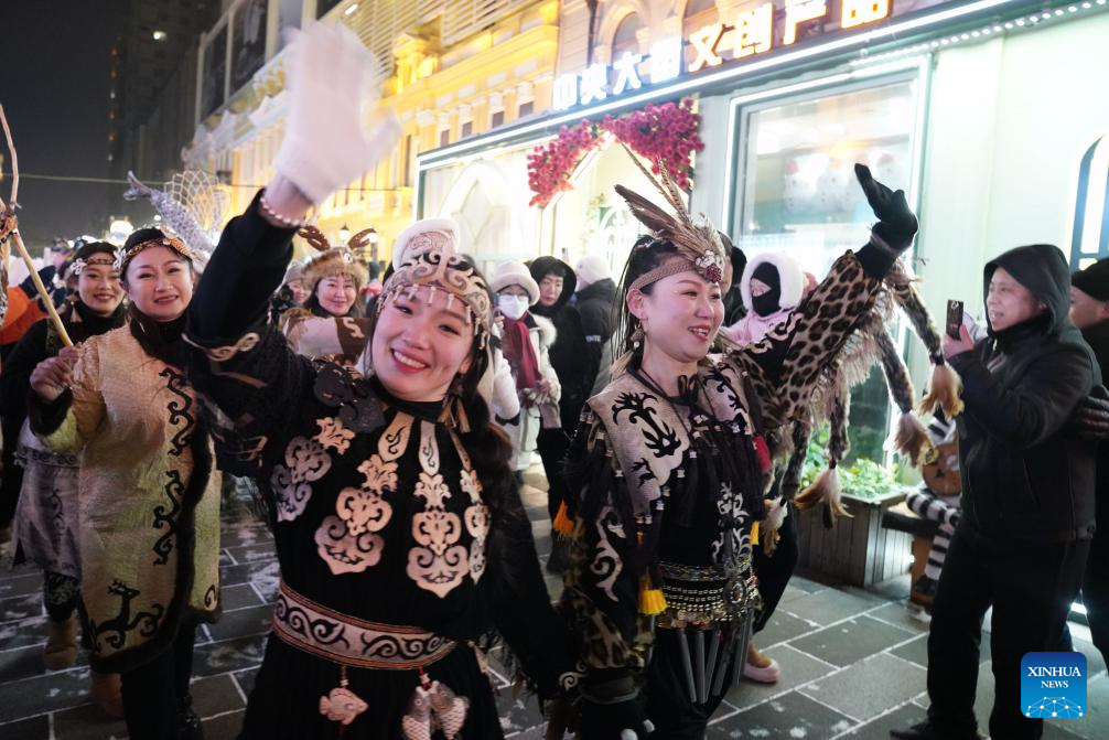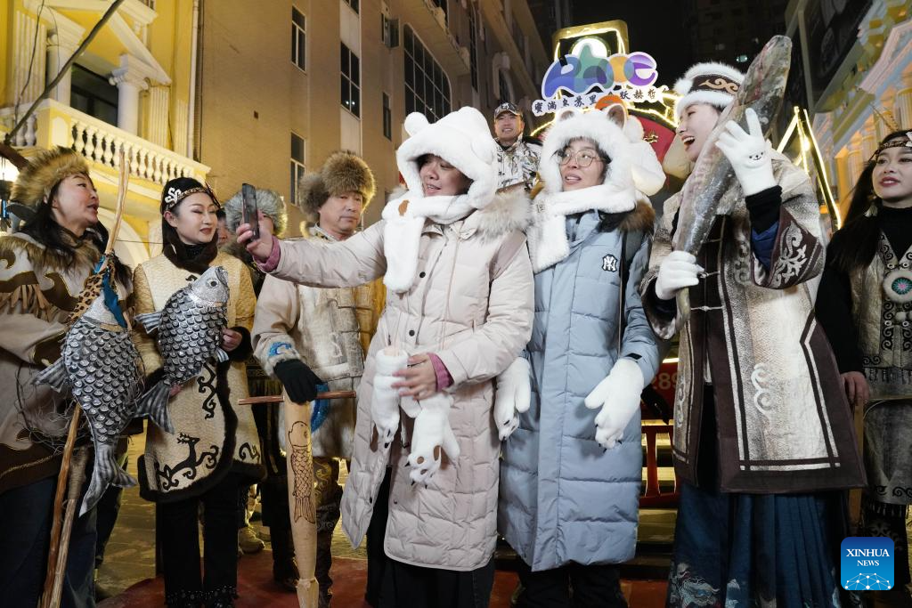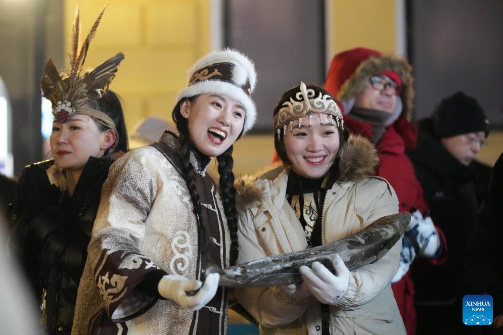 Hezhe people wearing traditional costumes interact with tourists in Harbin, northeast China's Heilongjiang Province, Jan. 6, 2024. (Xinhua/Wang Jianwei)