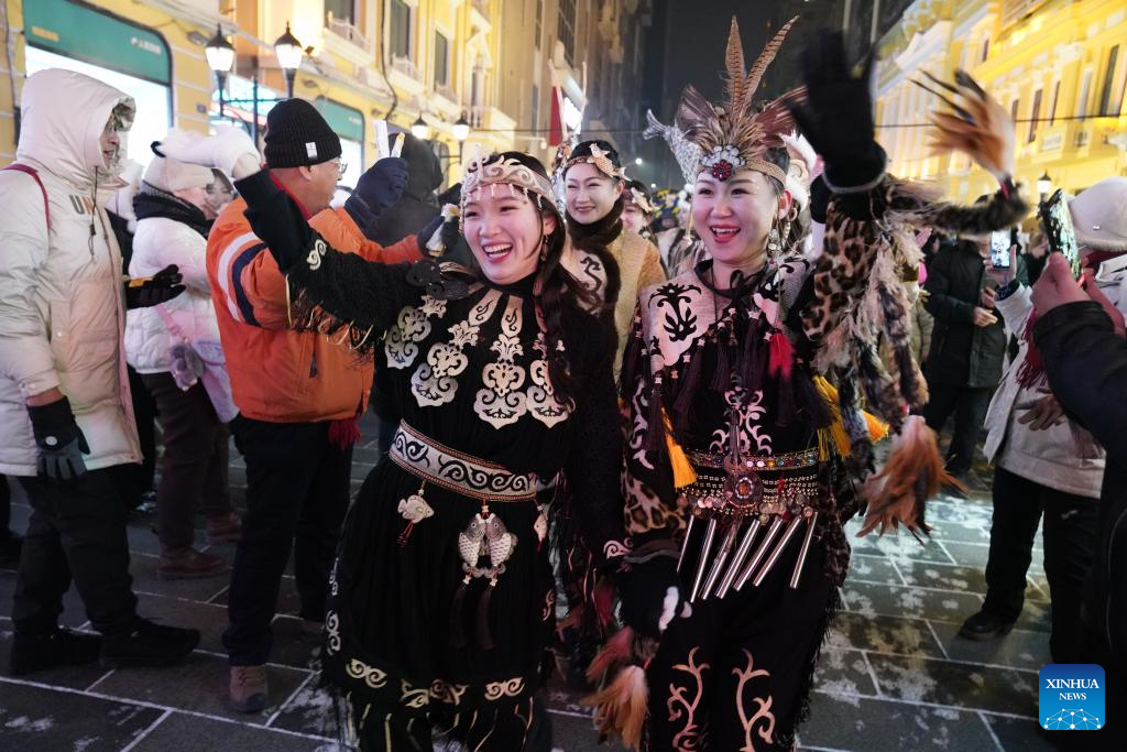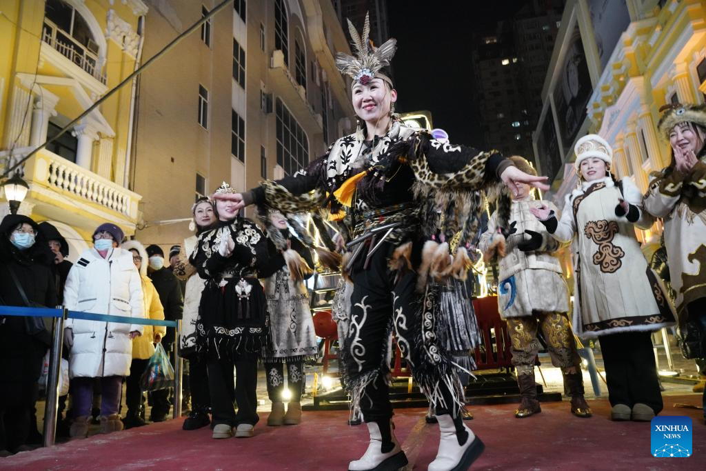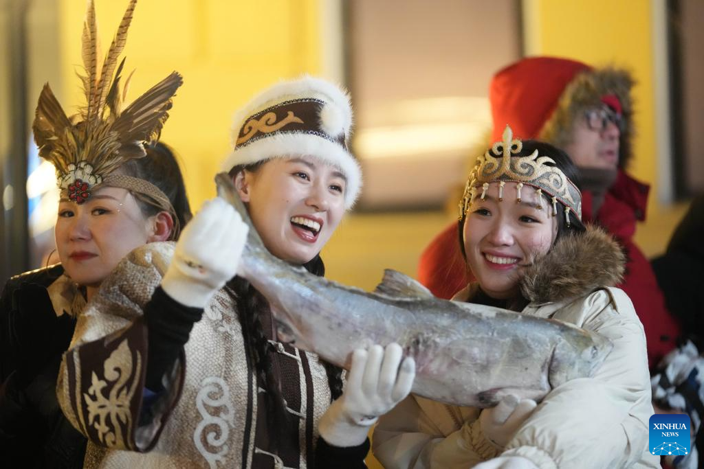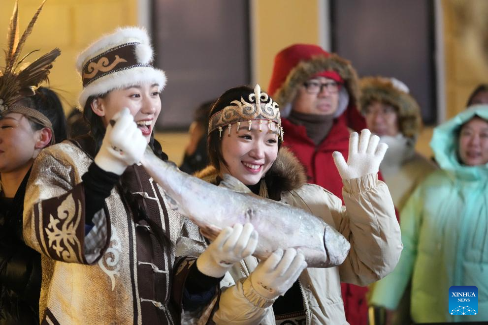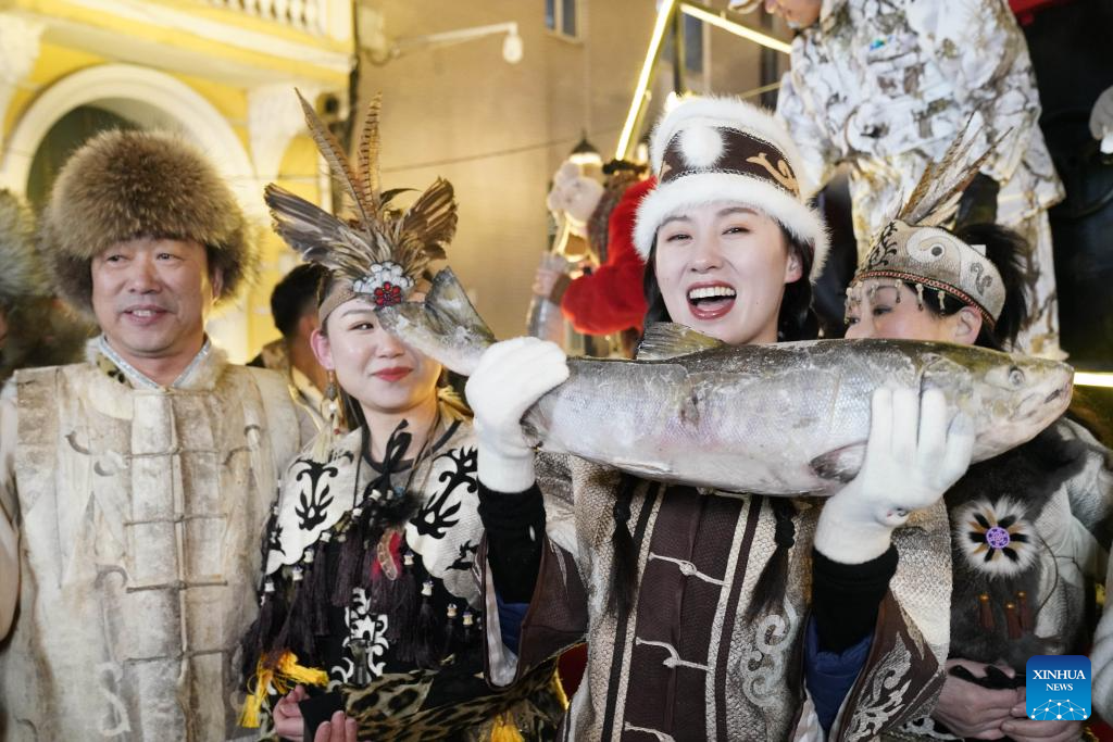 Hezhe people wearing traditional costumes interact with tourists in Harbin, northeast China's Heilongjiang Province, Jan. 6, 2024. (Xinhua/Wang Jianwei)
