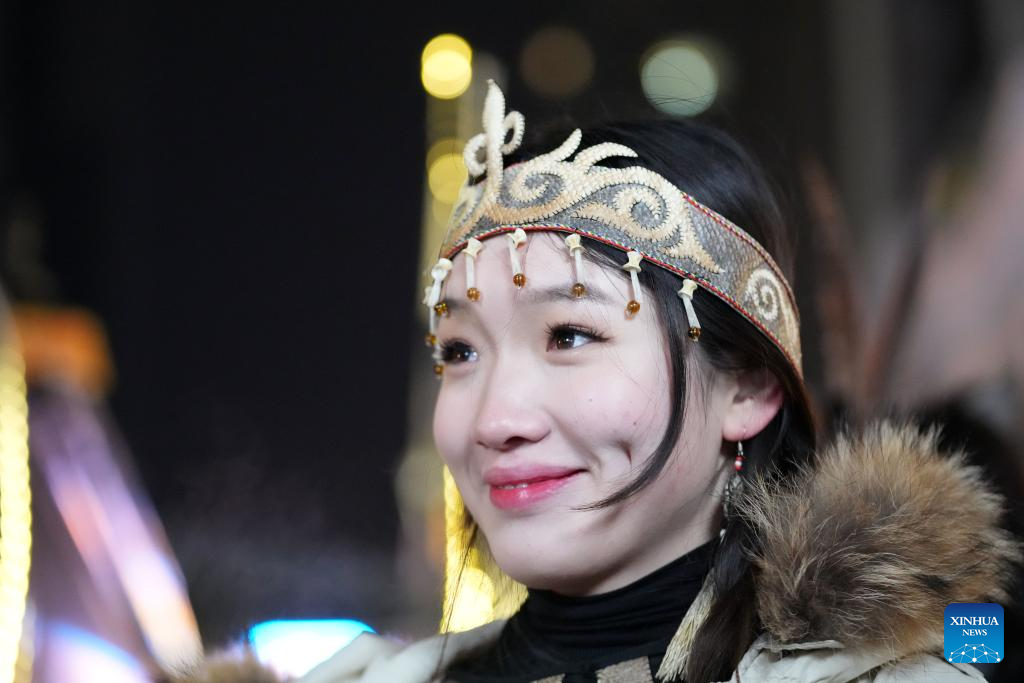 A Hezhe girl wearing traditional headwear made from fish skin takes part in a promoting event of her hometown in Harbin, northeast China's Heilongjiang Province, Jan. 6, 2024. (Xinhua/Wang Jianwei)