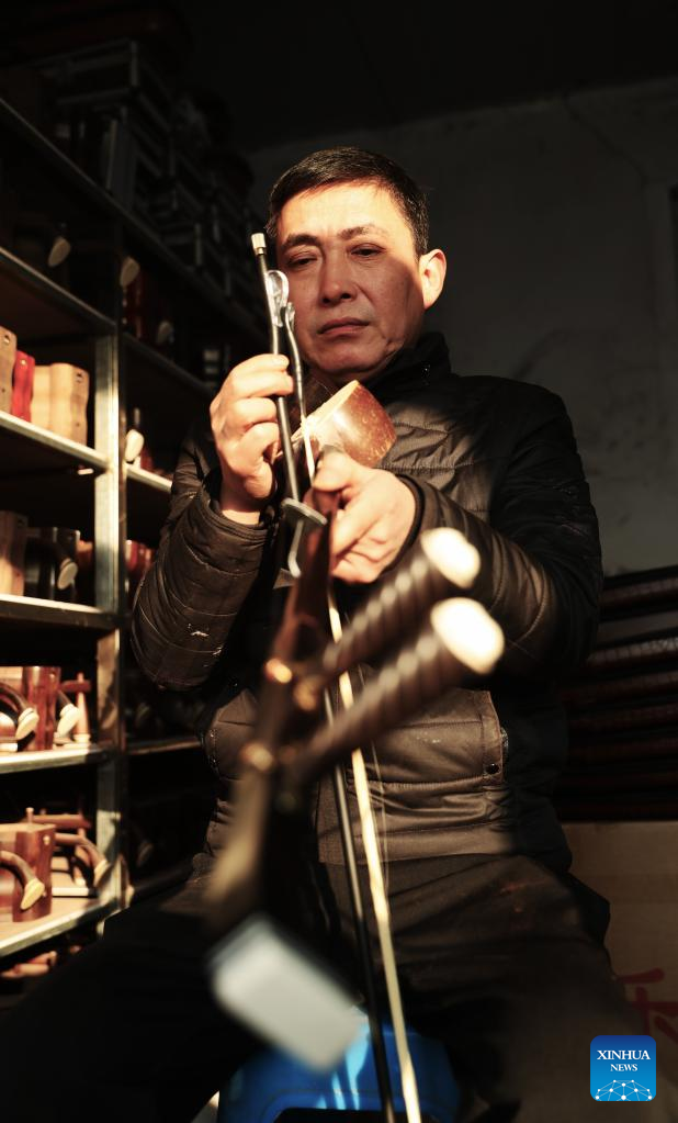 Gong Zhiguang checks and adjusts an erhu in Changtu County of Tieling City, northeast China's Liaoning Province, Dec. 28, 2023. (Xinhua/Yang Qing)