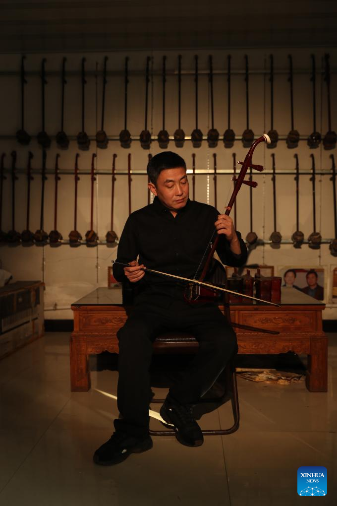 Gong Zhiguang plays erhu in Changtu County of Tieling City, northeast China's Liaoning Province, Dec. 28, 2023. (Xinhua/Yang Qing)