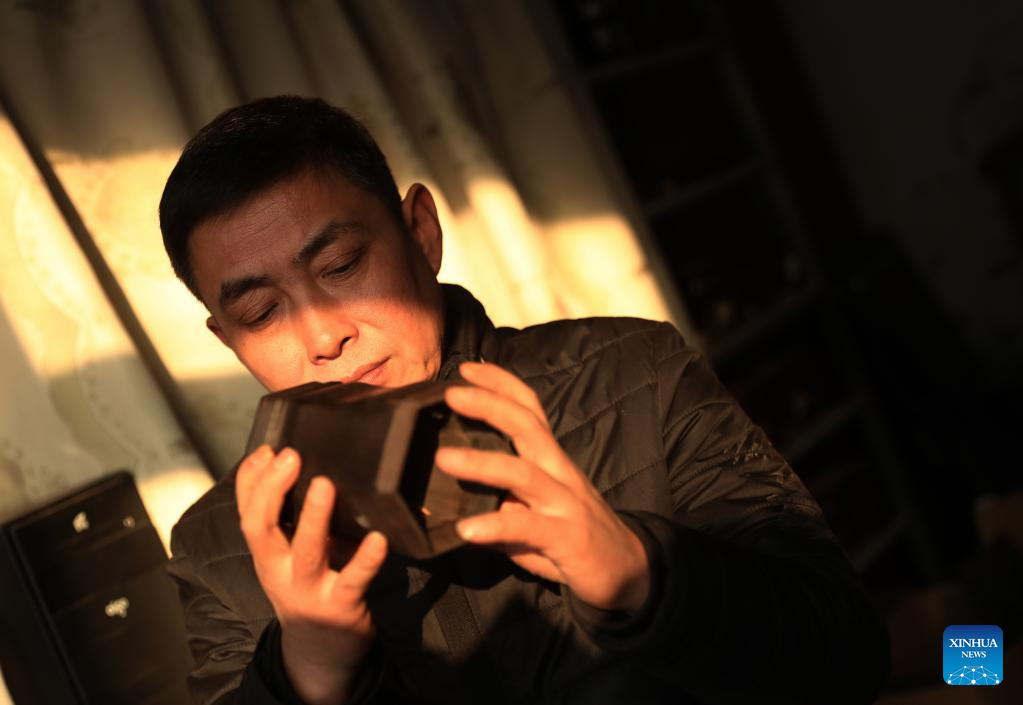 Gong Zhiguang grinds a block for erhu making in Changtu County of Tieling City, northeast China's Liaoning Province, Dec. 28, 2023. (Xinhua/Yang Qing)