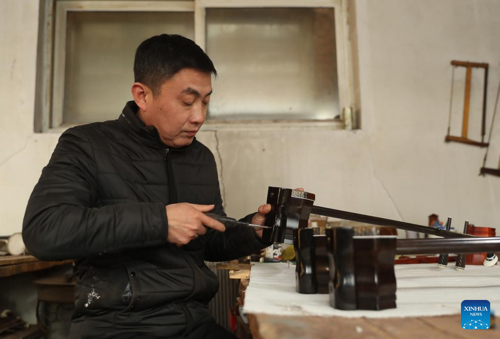 Gong Zhiguang assembles an erhu in Changtu County of Tieling City, northeast China's Liaoning Province, Dec. 28, 2023. (Xinhua/Yang Qing)