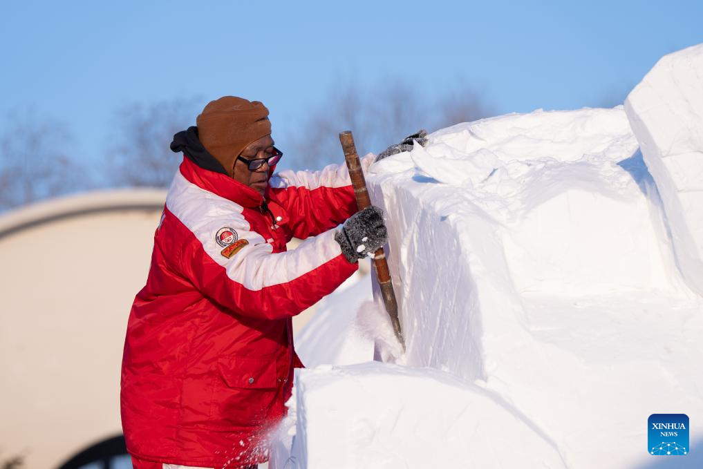 A contestant works on a snow sculpture at the Sun Island scenic area in Harbin, northeast China's Heilongjiang Province, Jan. 7, 2024. An international snow sculpture competition is held here, attracting snow sculptors from 12 countries. (Xinhua/Zhang Tao)