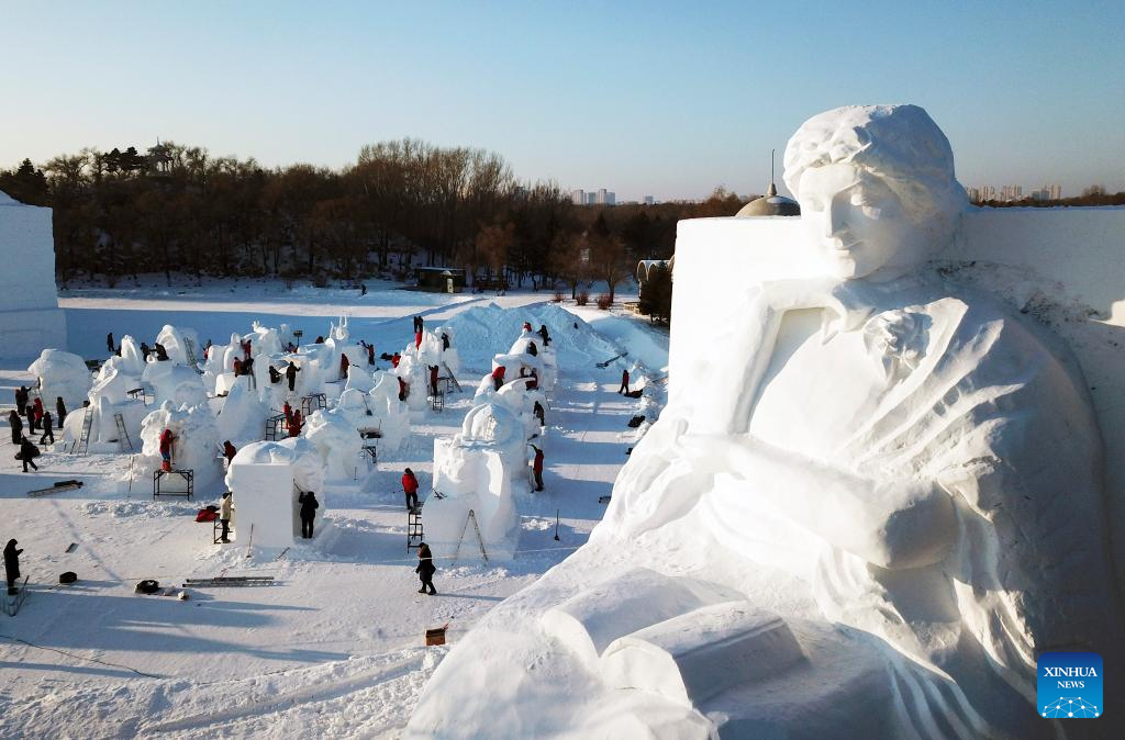 This aerial photo taken on Jan. 7, 2024 shows contestants working on snow sculptures at the Sun Island scenic area in Harbin, northeast China's Heilongjiang Province. An international snow sculpture competition is held here, attracting snow sculptors from 12 countries. (Xinhua/Wang Jianwei)