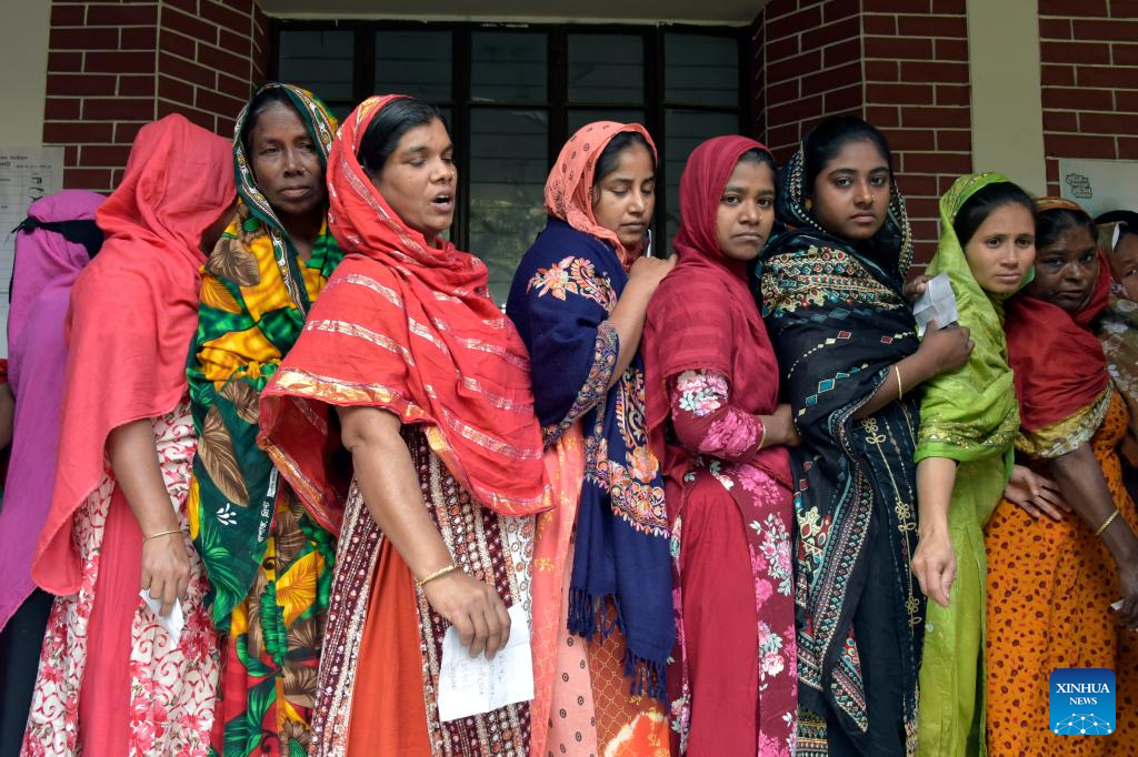 Female voters wait in line outside a polling station in Dhaka, Bangladesh, Jan. 7, 2024. (Xinhua)