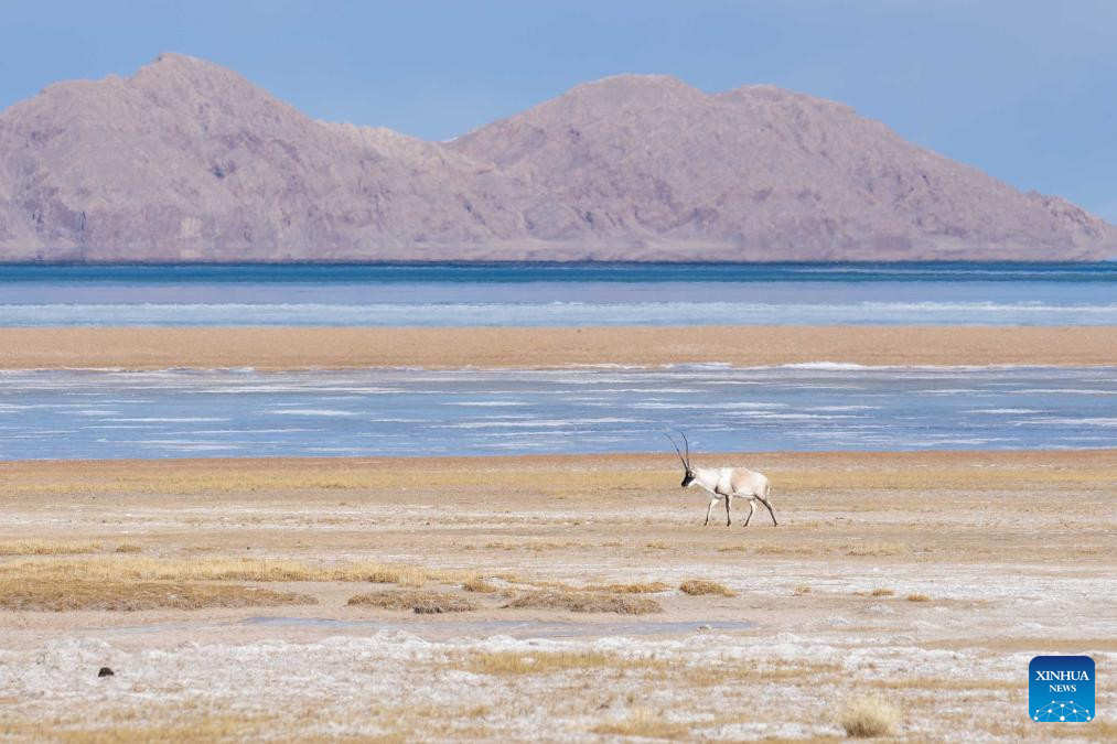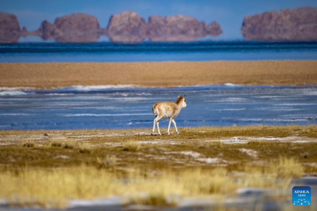 A Tibetan antelope is seen near Serling Tso Lake in southwest China's Xizang Autonomous Region, Jan. 5, 2024. (Xinhua/Tenzing Nima Qadhup)