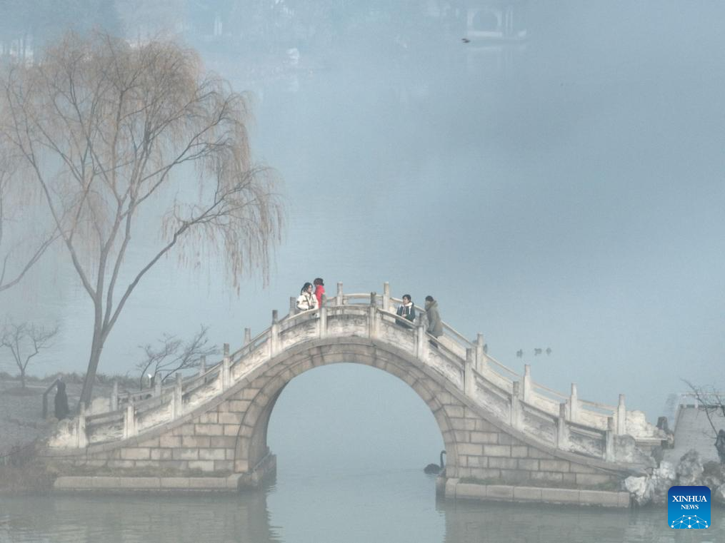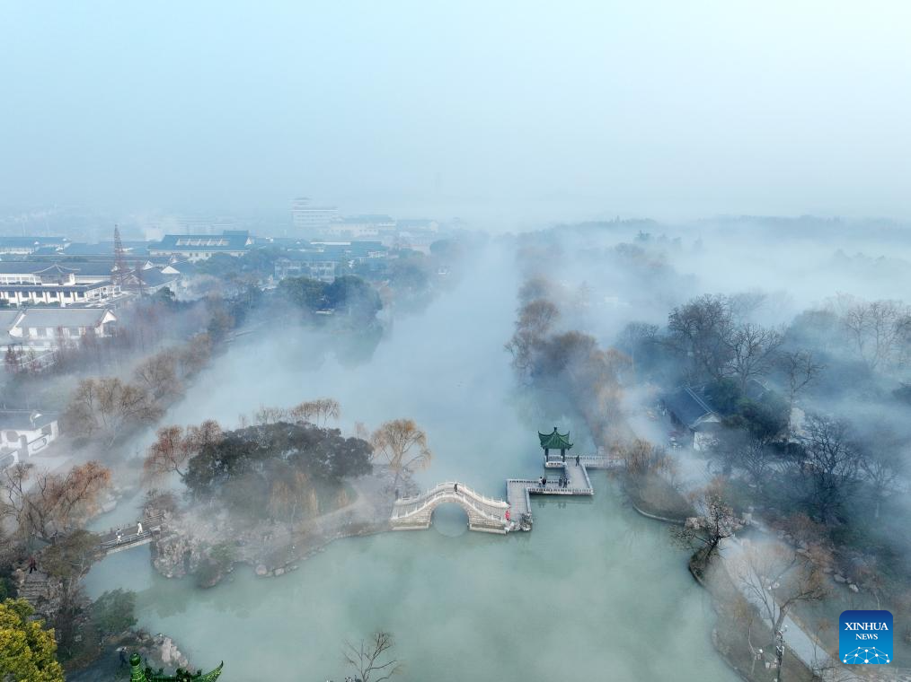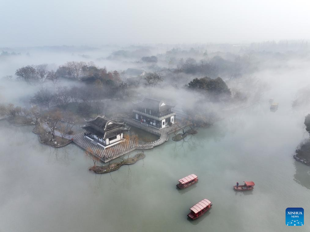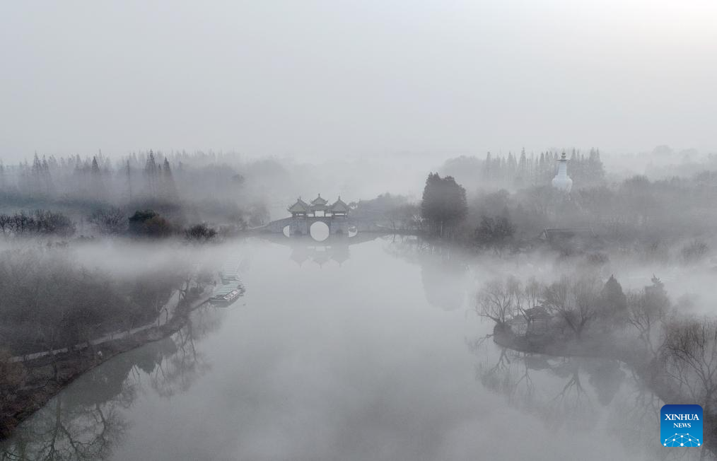 This aerial photo taken on Jan. 6, 2024 shows the Slender West Lake scenic spot shrouded in fog in Yangzhou, east China's Jiangsu Province. (Photo by Meng Delong/Xinhua)