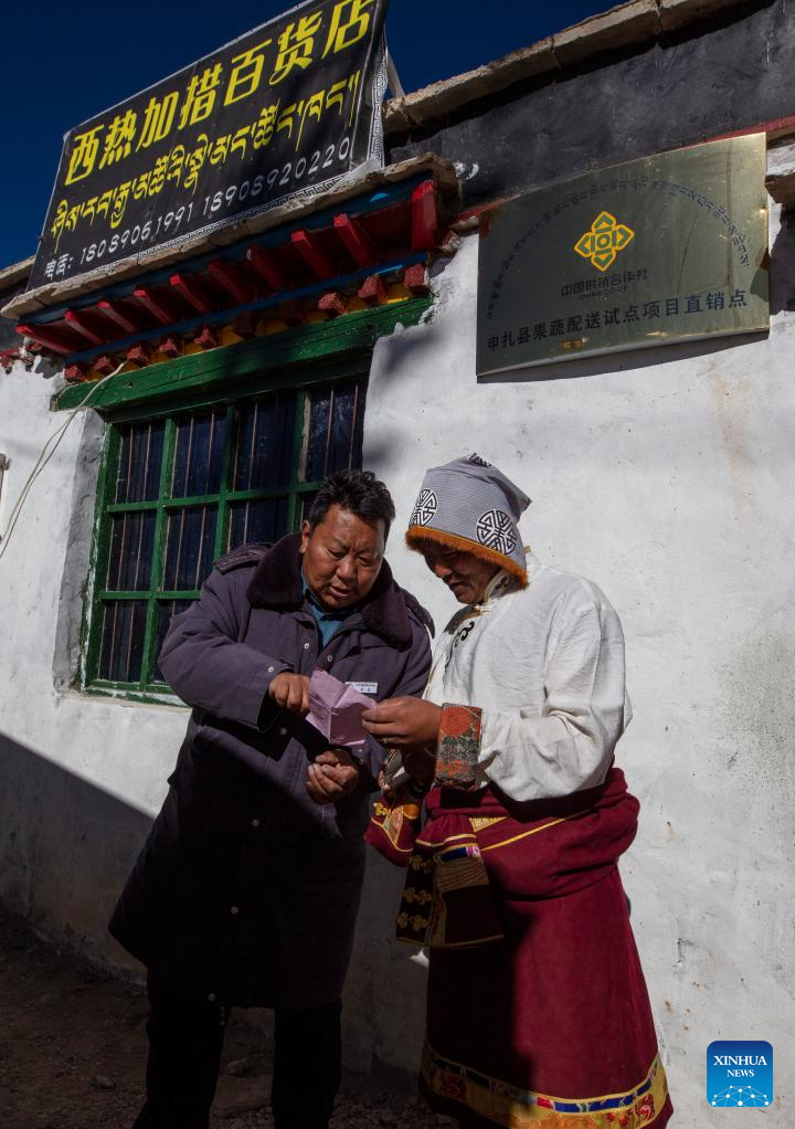 Store manager Sherab Gyatso (R) and Wuwa, distribution manager of Xainza County's Supply and Marketing Cooperative, check the delivery list at a direct sales store in the remote Beiga No.4 Village in Xainza County, southwest China's Xizang Autonomous Region, Jan. 5, 2024. (Xinhua/Jiang Fan)