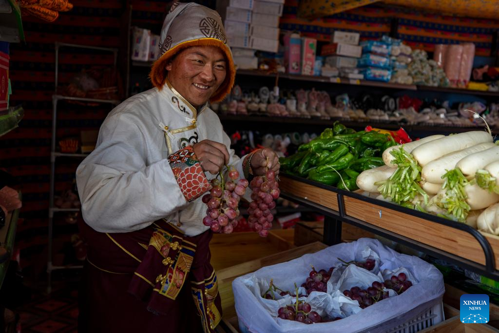 Sherab Gyatso, a store manager, sorts out grapes delivered here by Xainza County's Supply and Marketing Cooperative at a direct sales store in the remote Beiga No.4 Village in Xainza County, southwest China's Xizang Autonomous Region, Jan. 5, 2024. (Xinhua/Tenzing Nima Qadhup)
