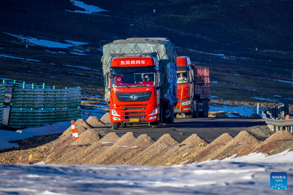 Trucks loaded with 50 tonnes of fresh fruits and vegetables purchased from Xining City of northwest China's Qinghai Province pass through the Tanggula Mountain pass in southwest China's Xizang Autonomous Region, Jan. 3, 2024. (Xinhua/Cao Bin)