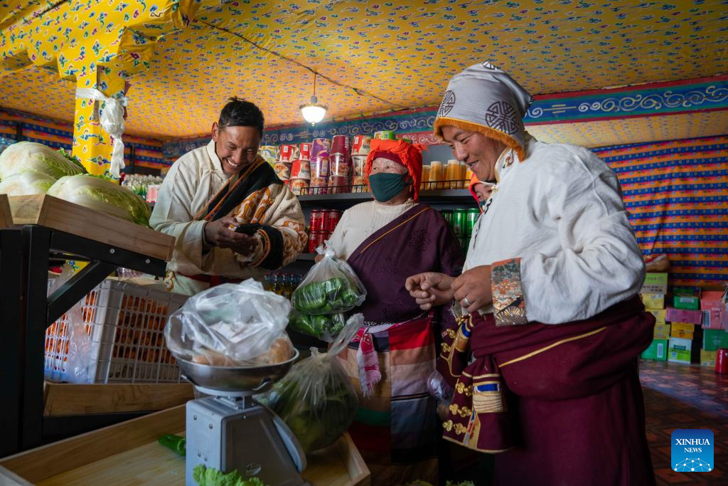 Sherab Gyatso (1st R), a store manager, weighs vegetables for a villager at a direct sales store in the remote Beiga No.4 Village in Xainza County, southwest China's Xizang Autonomous Region, Jan. 5, 2024. (Xinhua/Tenzing Nima Qadhup)