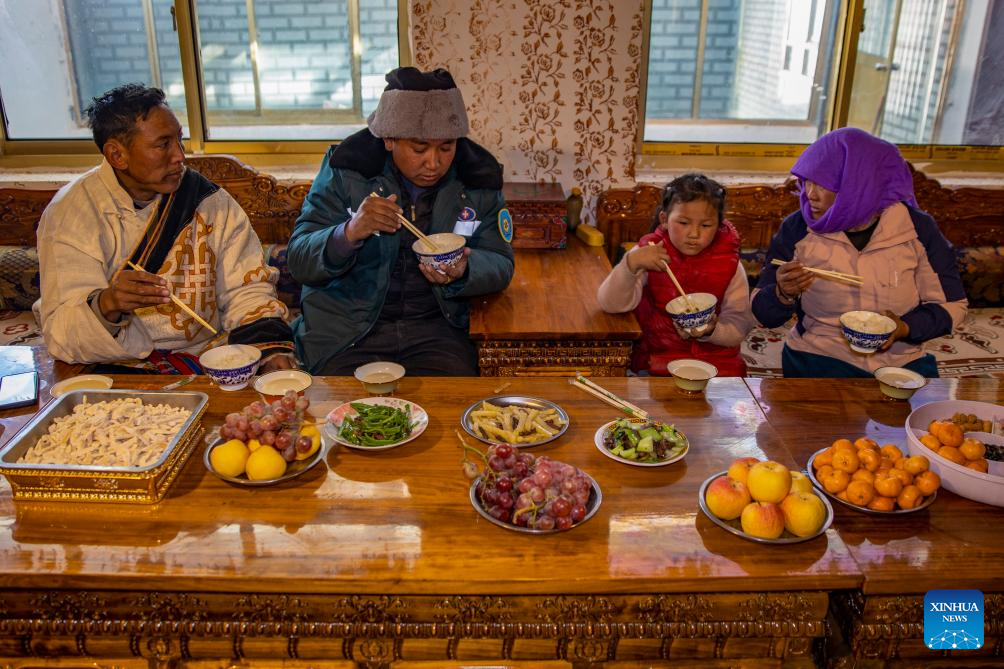 Villager Tsering Chodar (1st L) has dinner at home in the remote Beiga No.4 Village in Xainza County, southwest China's Xizang Autonomous Region, Jan. 5, 2024. (Xinhua/Jiang Fan)