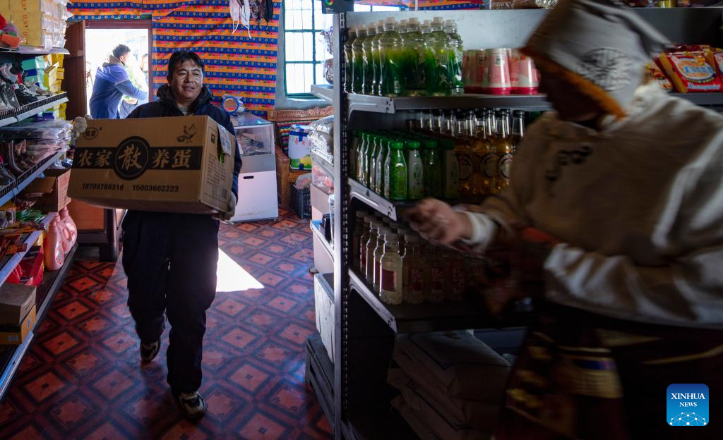 Bara, a distributor of Xainza County's Supply and Marketing Cooperative, prepares to deliver goods to a direct sales store in the remote Beiga No.4 Village, from the central store in Xainza County, southwest China's Xizang Autonomous Region, Jan. 5, 2024. (Xinhua/Jiang Fan)