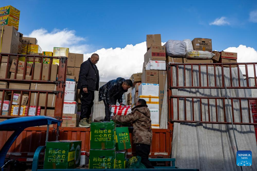 Staff members of Xainza County's Supply and Marketing Cooperative load goods to be delivered to remote towns in Xainza County onto a truck in Lhasa, southwest China's Xizang Autonomous Region, Jan. 2, 2024. (Xinhua/Jiang Fan)