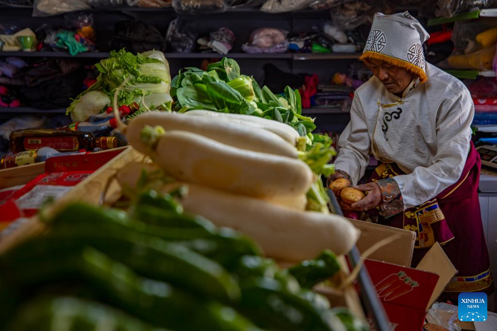 Sherab Gyatso, a store manager, sorts out vegetables delivered here by Xainza County's Supply and Marketing Cooperative at a direct sales store in the remote Beiga No.4 Village in Xainza County, southwest China's Xizang Autonomous Region, Jan. 5, 2024. (Xinhua/Jiang Fan)