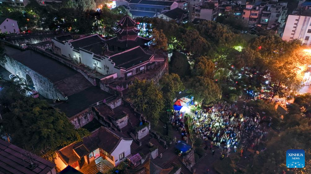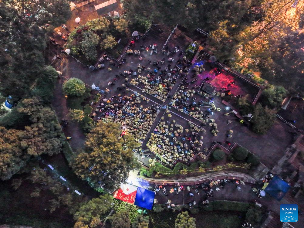 This aerial photo taken on Oct. 13, 2023 shows the site of a roadside concert at Wenchang Pavilion in Guiyang, southwest China's Guizhou Province. (Xinhua/Ou Dongqu)